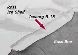 In 2000, an iceberg measuring 300 kilometers (180 miles) in length broke away from the Ross Ice Shelf. My red arrow on the satellite image (see photo) points out that elongated calved iceberg that was officially named B-15.
