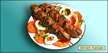 Marinated cubes of lamb grilled on a skewer. If vegetables such as onions or tomatoes are to complement the Shish Kebab, they are typically grilled separately.